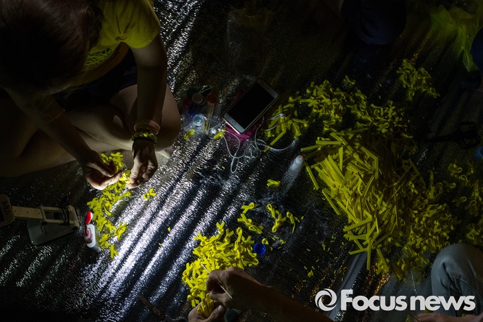 (서울=포커스뉴스) 25일 오후 서울 종로구 서울정부청사 앞에서 세월호 가족협의회 및 시민들이 세월호 특별법 개정과 온전한 인양을 촉구하며 농성을 벌이며 노란 리본 고리를 만들고 있다.