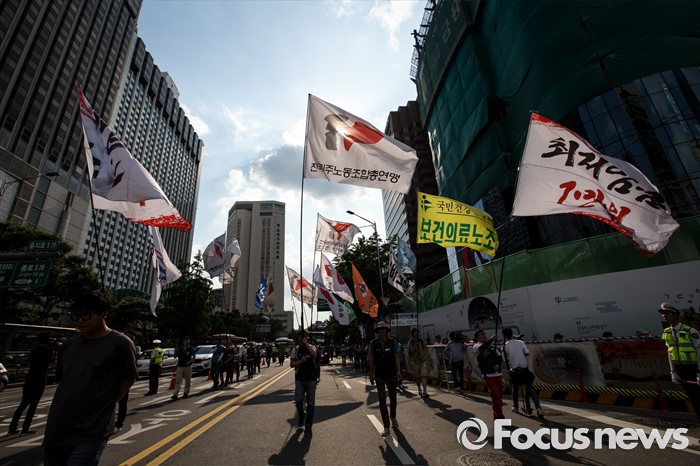 (서울=포커스뉴스) 25일 오후 서울 중구 시청광장에서 열린 '민주노총 전국노동자대회' 참석자들이 최저임금 1만원, 비정규직 철폐를 촉구하며 행진하고 있다.