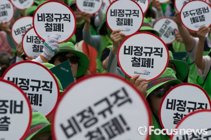 (서울=포커스뉴스) 25일 오후 서울 중구 시청광장에서 열린 '민주노총 전국노동자대회' 참석자들이 최저임금 1만원, 비정규직 철폐를 촉구하는 손펫말을 들고 있다.