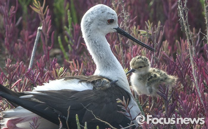 (인천=포커스뉴스) 지난 6월 18일 영종도 매립지 습지의 작은 섬 칠면초 둥지에서 갓 부화한 장다리물떼새가 어미 날개속에 얼굴만 내논 채 깃털을 말리고 있다.하루 일직 세상에 나온 형아는 어미 품 밖에서 동생을 기다리고 있다.