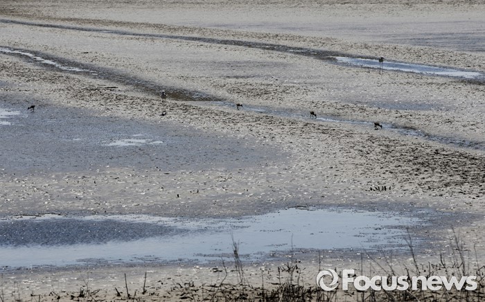 (인천=포커스뉴스)부화한 지 약 1 주일 정도로 영종도 매립지 습지에서 가장 늦게 세상에 나온장다리물떼새 어린새들이26일 오전 말라 가는습지에서 어미를 따라 물이 고인 곳에서 먹이를 찾고 있다.