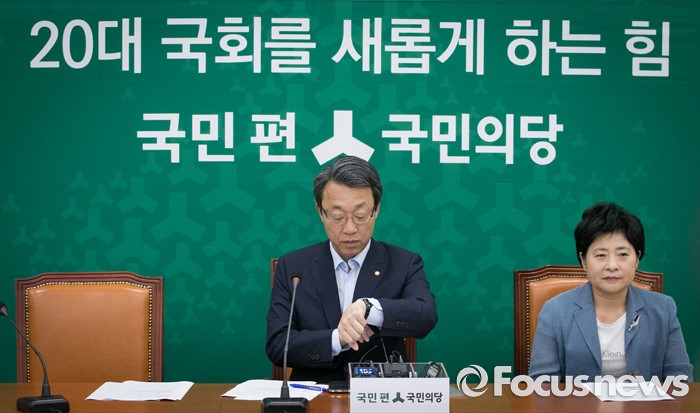 (서울=포커스뉴스) 김성식(왼쪽) 국민의당 정책위의장이 26일 오전 서울 여의도 국회에서 브렉시트 대응 정책제안 기자간담회에 앞서 시간을 확인하고 있다.