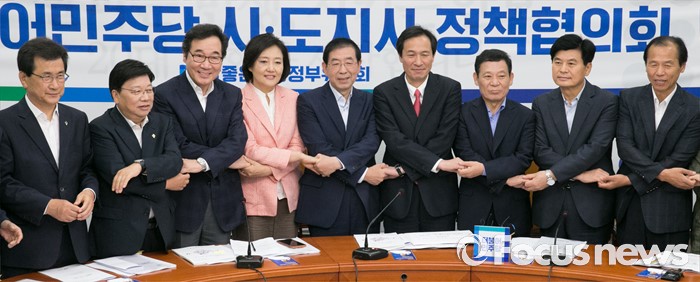 (서울=포커스뉴스) 26일 오전 서울 여의도 국회에서 열린 더불어민주당 시도지사 정책협의회에 참석한 단체장 및 의원들이 취재진을 향해 포즈를 취하고 있다. 왼쪽부터 이시종 충북도지사, 권선택 대전시장, 이낙연 전남도지사, 박영선 참좋은지방정부위원회 공동위원장, 박원순 서울시장, 우상호 원내대표, 윤장현 광주시장, 이춘희 세종시장, 최문순 강원도지사.
