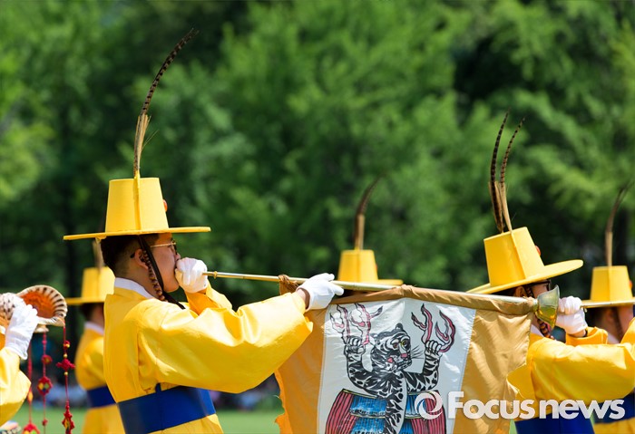 (서울=포커스뉴스) 26일 오후 서울 동작구 국립서울현충원 겨레얼마당에서 국방부 군악대와 의장대가 호국보훈의 달을 맞아 전통의장 및 퍼레이드 시범을 선보이고 있다.