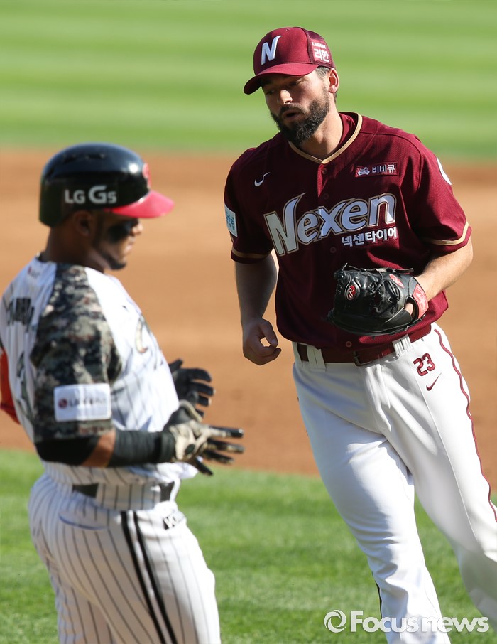 (서울=포커스뉴스) 26일 서울 잠실구장에서 열린 2016 프로야구 넥센-LG 경기 1회말 2사 3루에서 넥센 투수 맥그레거가 LG 히메네스의 투수앞 땅볼 타구를 처리하고 덕아웃으로 향하고 있다.