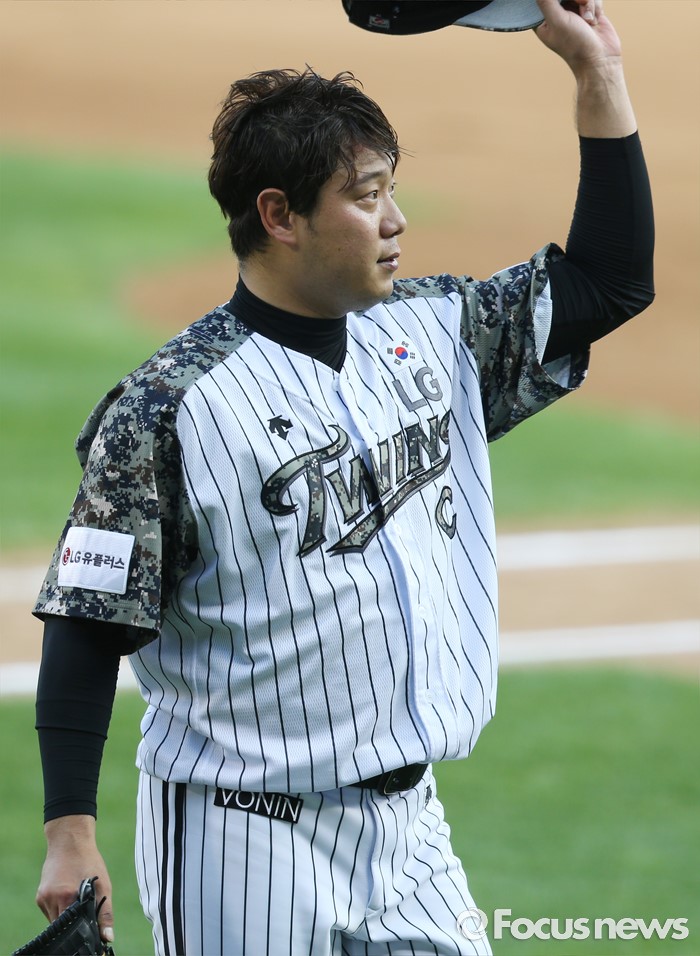 (서울=포커스뉴스) 26일 서울 잠실구장에서 열린 2016 프로야구 넥센-LG 경기 8회초 2사 2루에서 LG 선발투수 류제국이 교체돼 마운드를 내려 오며 팬을 향해 모자를 벗어 환호에 답하고 있다.