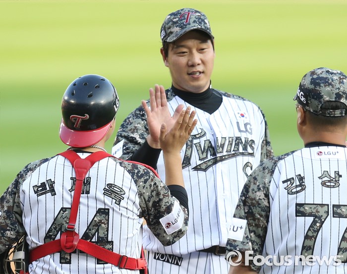 (서울=포커스뉴스) 26일 서울 잠실구장에서 열린 2016 프로야구 넥센-LG 경기 8회초 2사 2루에서 LG 투수 류제국이 교체돼 마운드를 내려가며 포수 박재욱과 손바닥을 마주치고 있다.