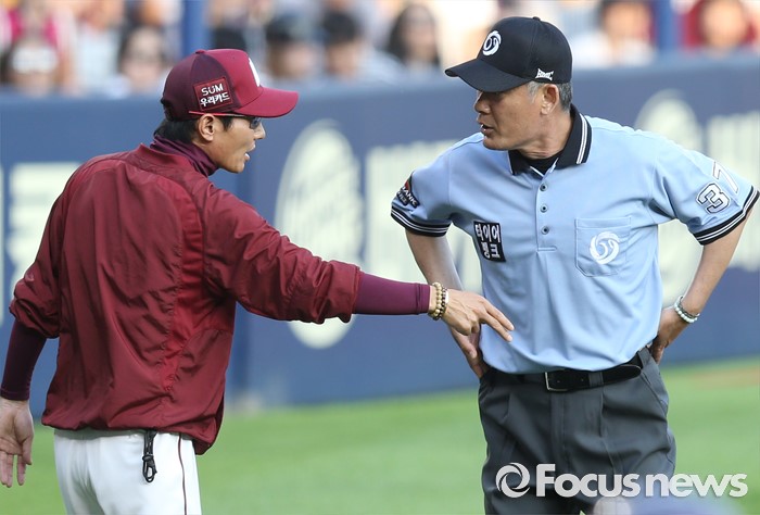 (서울=포커스뉴스) 26일 서울 잠실구장에서 열린 2016 프로야구 넥센-LG 경기 8회초 넥센 염경엽 감독이 김병주 3루심에게 3루주자 임병욱의 2루 공과 판정에 항의하고 있다.