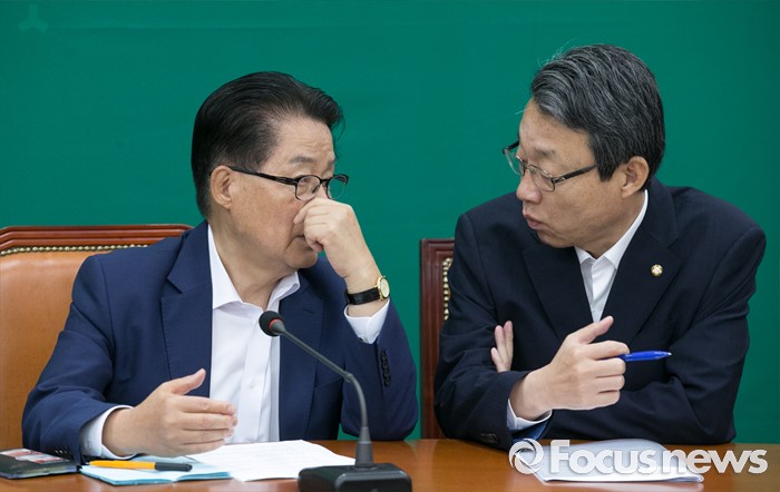 (서울=포커스뉴스) 27일 오전 서울 여의도 국회에서 열린 국민의당 최고위원회의에 참석한 박지원(왼쪽) 원내대표, 김성식 정책위의장이 대화하고 있다.