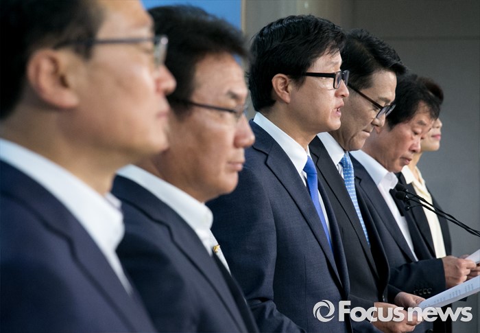 (서울=포커스뉴스) 홍영표 국회 환경노동위원장 등 더불어민주당 소속 환노위원들이 27일 오전 서울 여의도 국회 정론관에서 2017년 적용될 최저임금 결정시한을 하루 앞두고 인상 촉구 기자회견을 하고 있다.