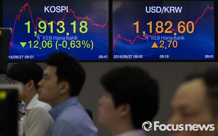 (서울=포커스뉴스) 브렉시트(영국 EU 탈퇴) 충격이 지속되고 있는 27일 오전 서울 중구 명동 KEB 하나은행 딜링룸에서 딜러들이 업무를 보고 있다.코스피는 전 거래일보다 23.39(1.21%) 포인트 하락한 1901.85로, 코스닥은 전 거래일보다 17.95(2.77%) 포인트 하락한 629.21에 시작했다. 원달러 환율은 5.6원 내린 1,174.3원으로 개장했다.