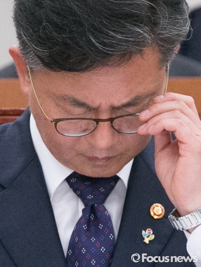 (서울=포커스뉴스) 27일 오전 서울 여의도 국회에서 열린 외교통일위원회 전체회의에 참석한 홍용표 통일부 장관이 안경을 착용하고 있다.