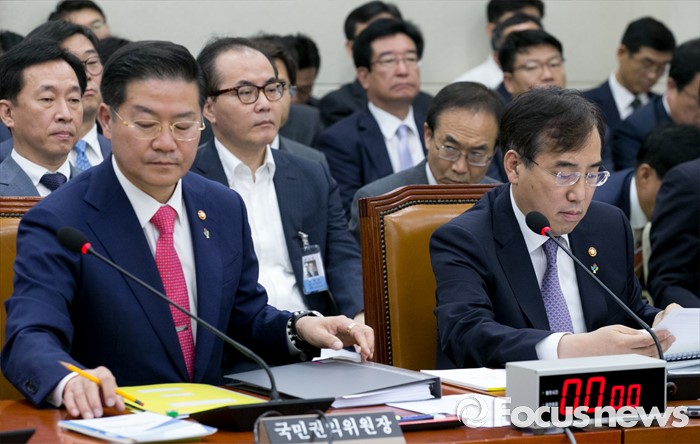 (서울=포커스뉴스) 27일 오전 서울 여의도 국회에서 열린 정무위원회 전체회의에 참석한 이석준(오른쪽) 국무조정실장과 성영훈 국민권익위원장이 자료를 살펴보고 있다.