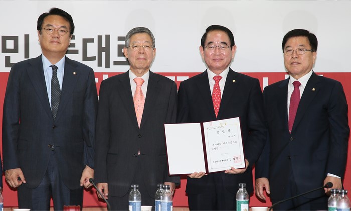 | △ 與 지도부와 기념촬영하는 박명재 신임 사무총장 |