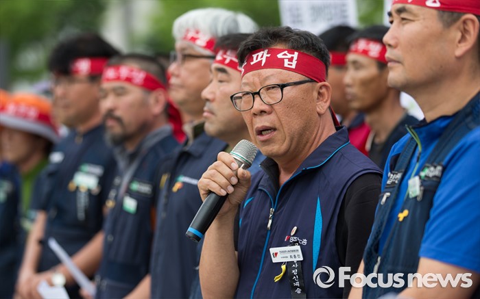 (서울=포커스뉴스) 최종진 전국민주노동조합 총연맹 수석부위원장이 27일 오전 서울 종로구 정부서울청사 앞에서 열린 7.6 총파업 총력투쟁 기자회견에 참석해 모두발언 하고 있다.