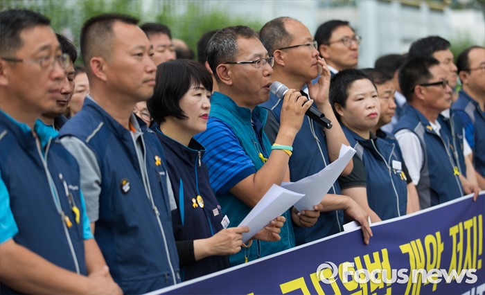 (서울=포커스뉴스) 전국공무원노동조합 조합원들이 27일 오전 서울 종로구 정부서울청사 앞에서 성과퇴출제 폐지, 공무원법 개악 저지 촉구 지도부 단식농성 투쟁 기자회견을 하고 있다.
