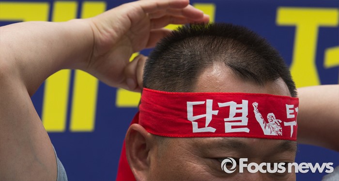 (서울=포커스뉴스) 27일 오전 서울 종로구 정부서울청사 앞에서 열린 성과퇴출제 폐지, 공무원법 개악 저지 촉구 전공노 지도부 단식농성 투쟁 기자회견 중 전국공무원노동조합 조합원이 빨간 머리끈을 묶고 있다.
