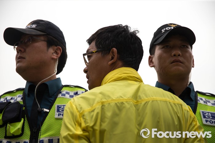 (서울=포커스뉴스) 27일 오후 서울 종로구 정부서울청사 앞에서 경찰 관계자들과 세월호 관계자가 대치하고 있다.