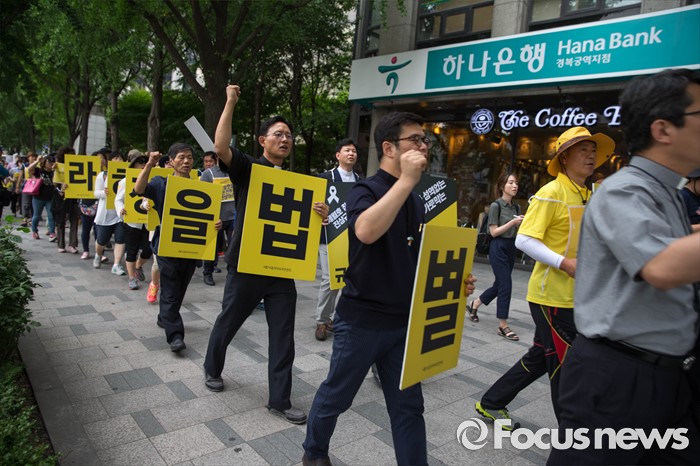 (서울=포커스뉴스) 27일 오후 서울 종로구 정부서울청사 앞에 세월호 관계자들이 세월호 특별법 개정 및 선체 인양을 촉구하는 기자회견을 하기 위해 청운동주민센터 앞으로 이동하고 있다.
