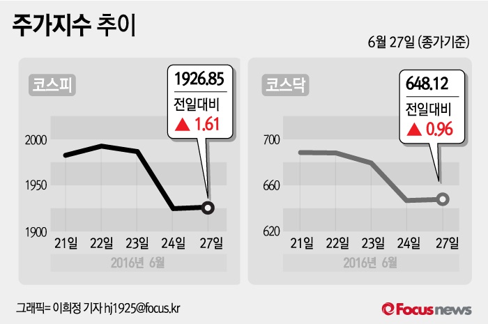 (서울=포커스뉴스) 27일 코스피지수는 지난 금요일보다 0.08%(1.61포인트) 오른 1926.85에 장을 마쳤다. 코스닥지수는 지난 금요일 대비 0.15%(0.96포인트) 오른 648.12에 마감했다.