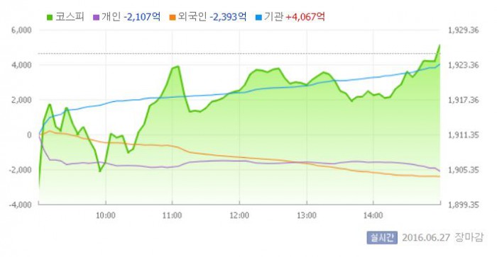 (서울=포커스뉴스) 코스피가 브렉시트(영국의 유럽연합 탈퇴) 충격을 딛고 기관의 대규모 매수에 힘입어 강보합 마감했다.