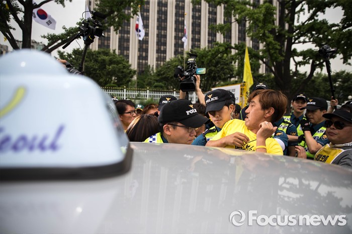 (서울=포커스뉴스) 27일 오후 서울 종로구 정부서울청사 앞에서 세월호 관계자들이 기자회견에 쓰일 은박 돗자리를 택시에서 꺼내려 하자 경찰병력들이 이를 제지하고 있다.