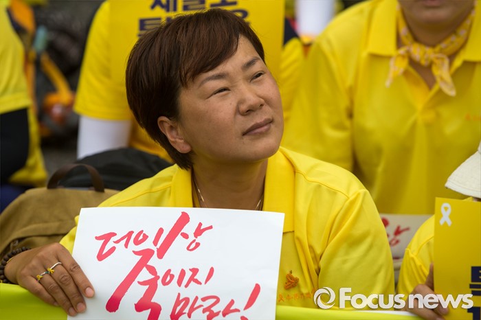 (서울=포커스뉴스) 27일 오후 서울 종로구 청운효자동주민센터 앞에서 416 가족협의회와 416 연대 관계자들이 세월호 특조위 강제해산과 박근혜 정부를 규탄하는 기자회견을 하고 있다.
