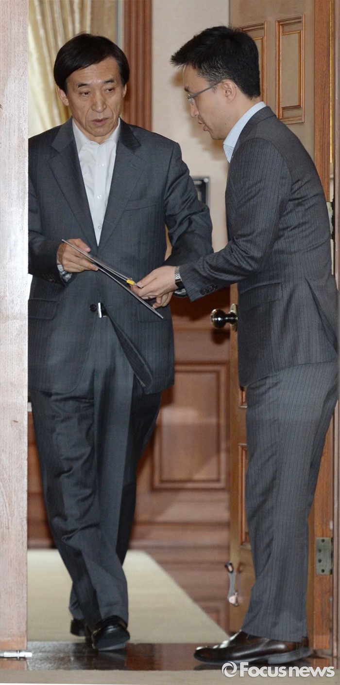 | △ 긴급 간부회의 참석하는 이주열 |