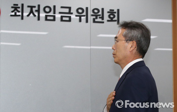 (세종=포커스뉴스) 박준성 최저임금위원회 위원장이 27일 오후 세종시 정부세종청사 고용노동부 전원회의실에서 열린 최저임금위원회 제6차 전원회의에서 국기에 대한 경례를 하고 있다.