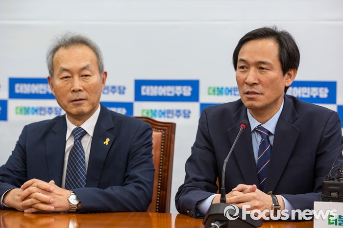 (서울=포커스뉴스) 우상호(오른쪽) 더불어민주당 원내대표가 27일 오후 서울 여의도 국회에서 이석태 세월호특별조사위원회 위원장과 면담에 앞서 발언 하고 있다.