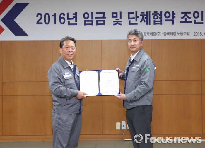 (서울=포커스뉴스) 동국제강 노사는 27일 인천제강소에서 '2016년 임금 및 단체협약 조인식'을 갖고, 임금피크제에 합의했다.