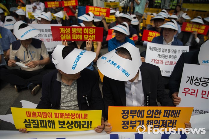 (서울=포커스뉴스) 28일 오전 서울 종로구 정부서울청사 앞에서 개성공단 입주기업 비대위 관계자들이 방북 승인을 촉구하는 집회를 하고 있다.