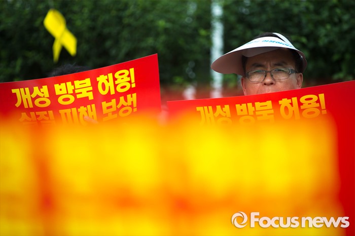 (서울=포커스뉴스) 28일 오전 서울 종로구 정부서울청사 앞에서 개성공단 입주기업 비대위 관계자들이 방북 승인을 촉구하는 집회를 하고 있다.