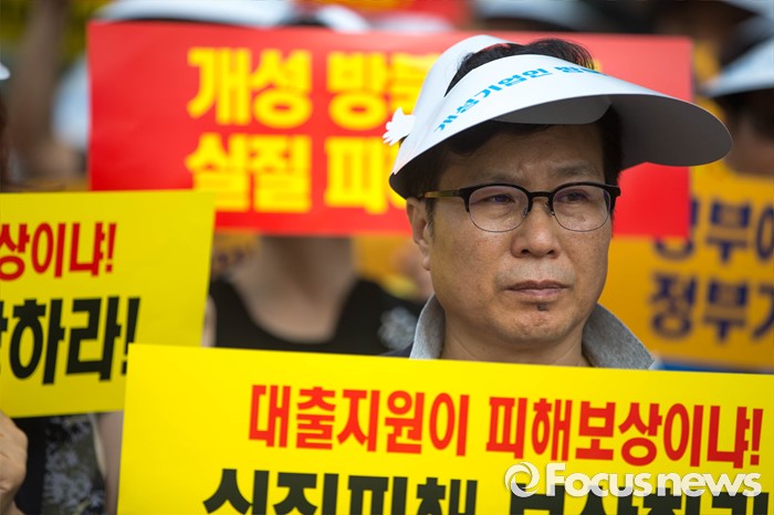 (서울=포커스뉴스) 28일 오전 서울 종로구 정부서울청사 앞에서 개성공단 입주기업 비대위 관계자들이 방북 승인을 촉구하는 집회를 하고 있다.