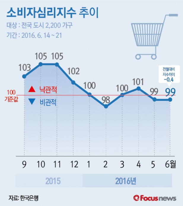 (서울=포커스뉴스) 28일 한국은행이 발표한 '2016년 6월 소비자동향조사 결과'를 보면 6월 소비심리지수는 지난달과 같은 99로 조사됐다.
