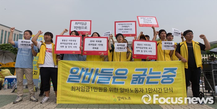 (서울=포커스뉴스) 28일 오전 서울 여의도 국회 앞에서 알바노조 조합원들이 용윤신 사무국장 단식농성 시작 기자회견 중 최저임금 1만원을 요구하는 구호를 외치고 있다.