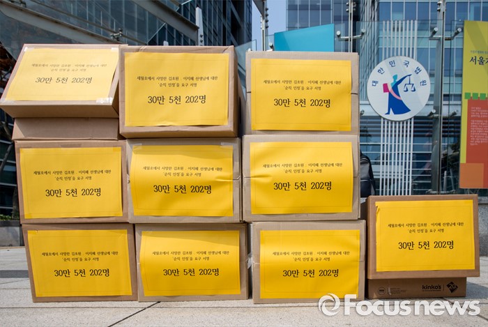 (서울=포커스뉴스) 28일 오전 서울행정법원 앞에서 열린 세월호 희생 기간제교사 순직 인정 촉구 소송 기자회견장 앞에 순직 인정 요구 서명서를 담을 상자들이 쌓여 있다.