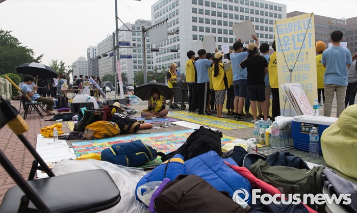 (서울=포커스뉴스) 28일 오전 서울 여의도 국회 앞에 알바노조 조합원들의 최저임금 1만원 요구 단식농성 물품들이 놓여져 있다. 알바노조는 지난 16일 부터 박정훈 위원장과 이가현, 우람 조합원을 시작으로 12일째 단식 농성 중이다.