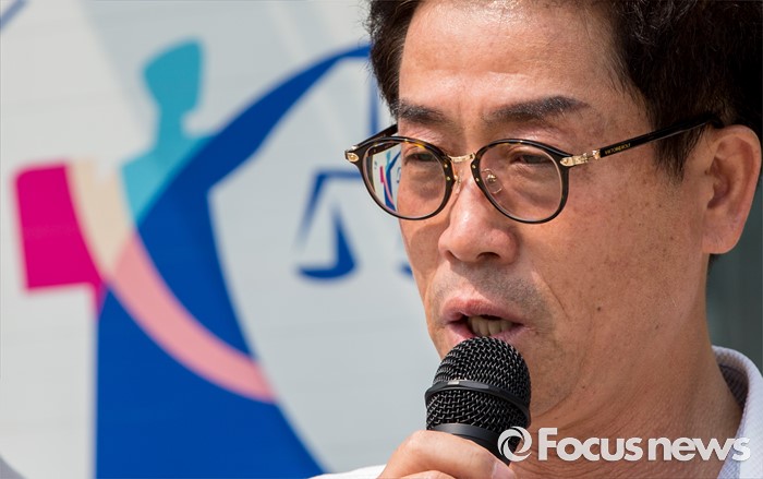 (서울=포커스뉴스) 28일 오전 서울행정법원 앞에서 열린 세월호 희생 기간제교사 순직 인정 촉구 소송 기자회견에 참석한 故 김초원 교사의 부친 성욱씨가 순직 인정을 촉구하는 발언을 하고 있다.