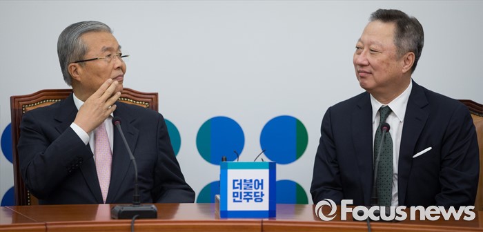 (서울=포커스뉴스) 김종인(왼쪽) 더불어민주당 비상대책위원회 대표가 28일 오전 서울 여의도 국회에서 박용만 대한상공회의소 회장을 접견하고 있다.