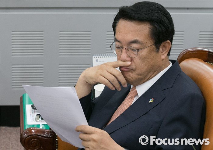 (서울=포커스뉴스) 28일 오전 서울 여의도 국회에서 정진석 새누리당 원내대표가 박용만 대한상공회의소 회장을 기다리며 자료를 보고 있다.