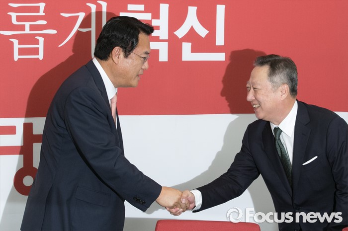 (서울=포커스뉴스) 정진석(왼쪽) 새누리당 원내대표가 28일 오전 서울 여의도 국회를 방문한 박용만 대한상공회의소 회장과 인사하고 있다.