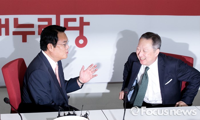(서울=포커스뉴스) 정진석(왼쪽) 새누리당 원내대표가 28일 오전 서울 여의도 국회를 방문한 박용만 대한상공회의소 회장과 면담을 하고 있다.