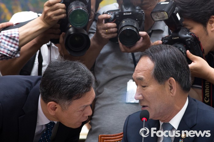 (서울=포커스뉴스) 박승춘(오른쪽) 국가보훈처장이 28일 오전 서울 여의도 국회에서 열린 정무위원회에 참석해 최완근 국가보훈처 차장과 대화를 나누고 있다.