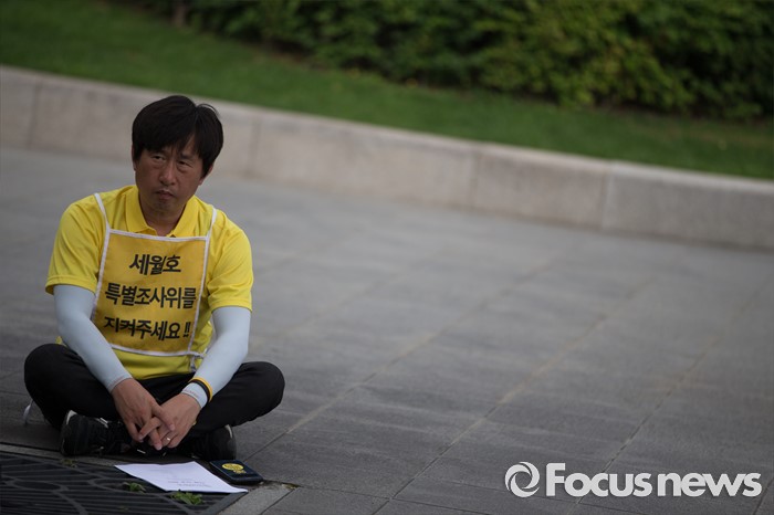 (서울=포커스뉴스) 28일 오전 서울 종로구 정부서울청사 인근 공원에서 열린4.16가족협의회·4.16연대 '세월호 특조위 강제해산에 대응하는 각계 긴급 회의'에 가족협의회 및 시민들이 참석하고 있다.