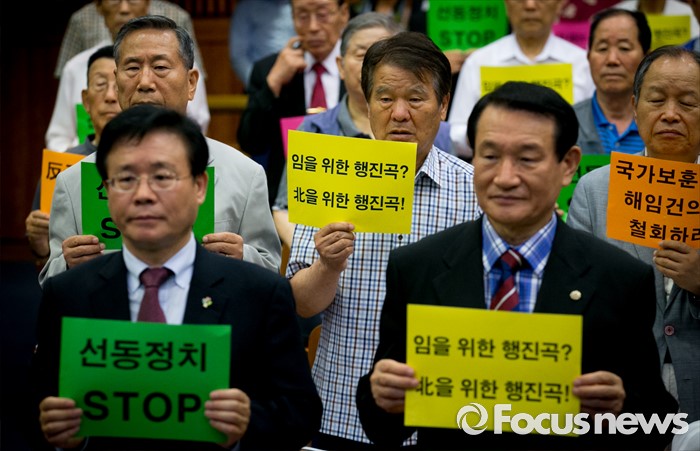 (서울=포커스뉴스) 28일 오전 서울 여의도 국회 헌정기념관에서 열린 '임을 위한 행진곡' 기념곡 지정저지 범국민대책본부 출범식 및 결의대회에 참석한 관련단체 회원 및 참석자들이 피켓을 들고 구호를 외치고 있다.