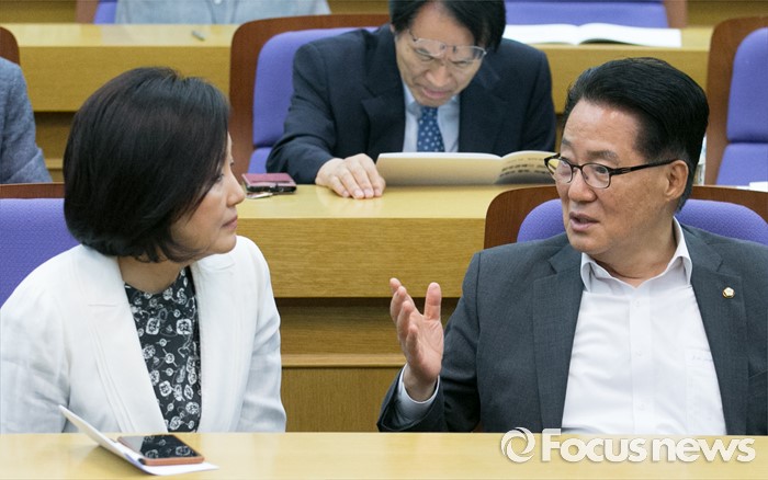 (서울=포커스뉴스) 28일 오전 서울 여의도 국회 의원회관에서 열린 '한국적 제3의 길' 창립 기념 초청 강연, '한국경제와 20대 국회가 가야할 길'에 참석한 박영선(왼쪽) 더불어민주당 의원, 박지원 국민의당 원내대표가 대화하고 있다.