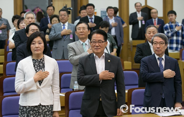 (서울=포커스뉴스) 28일 오전 서울 여의도 국회 의원회관에서 열린 '한국적 제3의 길' 창립 기념 초청 강연, '한국경제와 20대 국회가 가야할 길'에 참석한 박영선(앞줄 왼쪽부터) 더불어민주당 의원, 박지원 국민의당 원내대표, 정운찬 동반성장연구소 이사장이 국기에 대한 경례를 하고 있다.