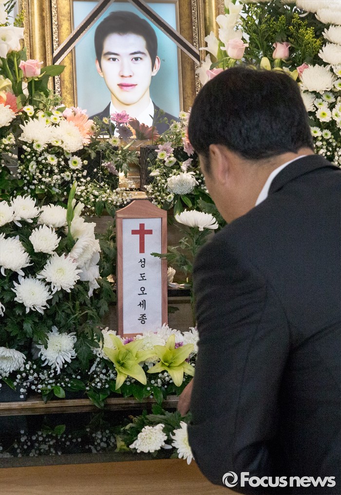 (서울=포커스뉴스) 28일 오후 서울 성동구 한양대학교병원 장례식장에 마련된 故 오세종(34) 전 쇼트트랙 국가대표 선수의 빈소를 찾은 한 조문객이 헌화하고 있다.