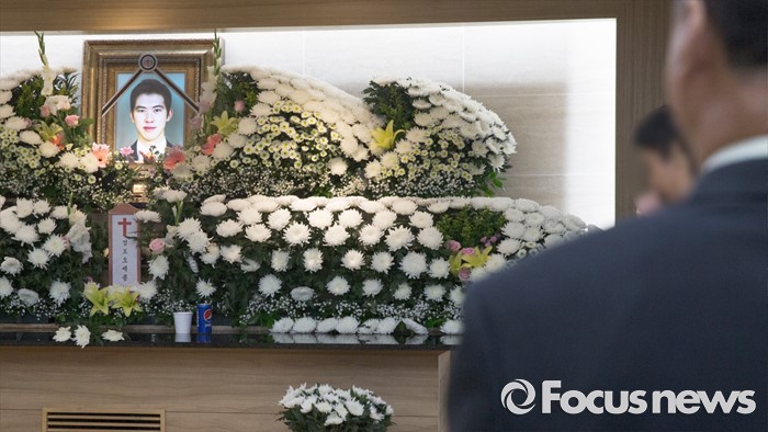 (서울=포커스뉴스) 28일 오후 서울 성동구 한양대학교병원 장례식장에 마련된 故 오세종(34) 전 쇼트트랙 국가대표 선수의 빈소를 찾은 한 조문객이 영정을 바라보고 있다.